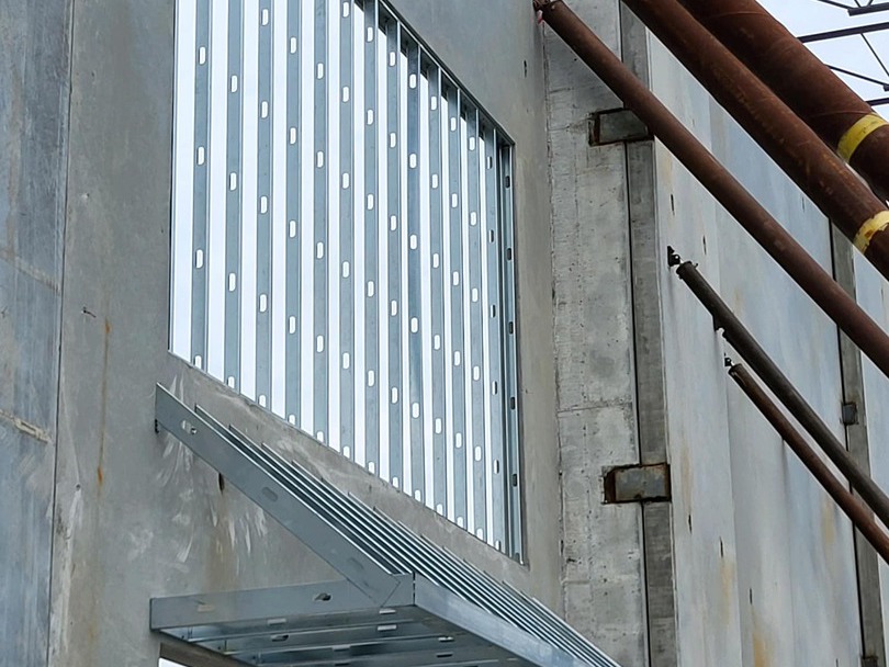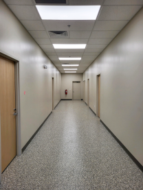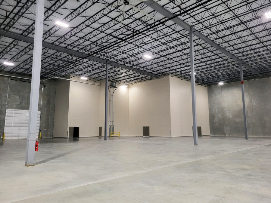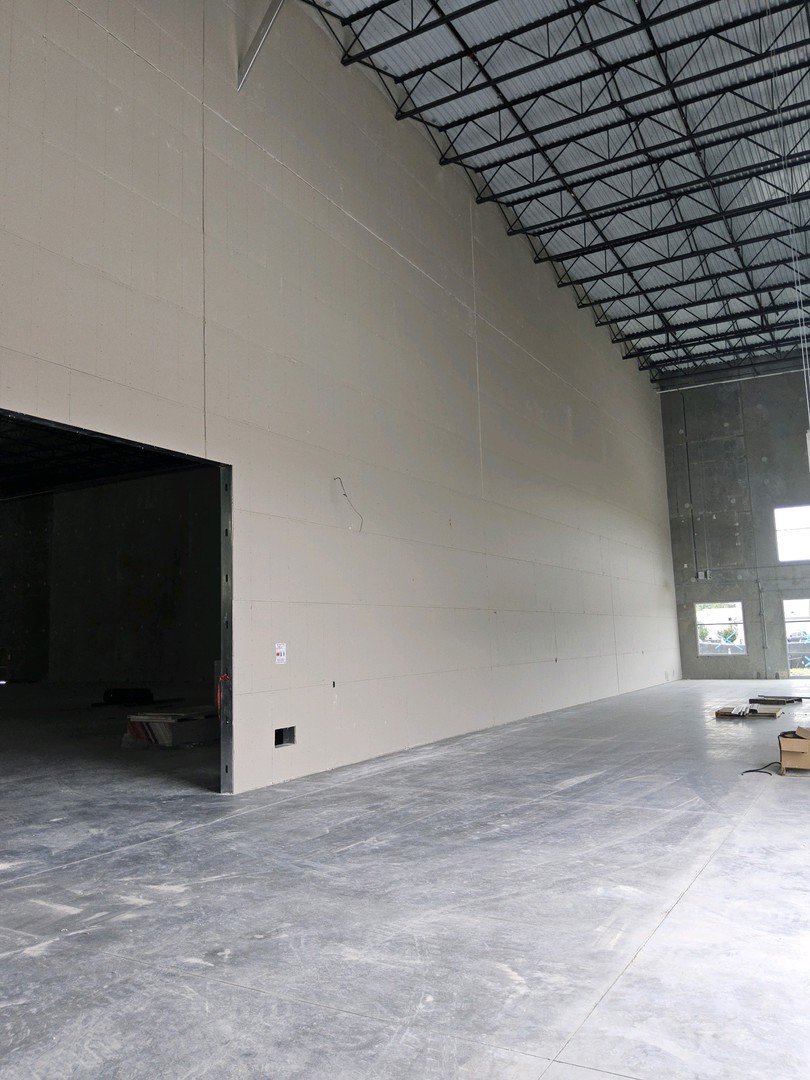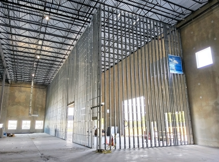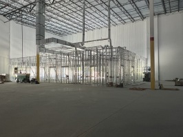 For this warehouse distribution center we installed both heavy and light guage structural studs for walls and ceilings, as well as drywall, acoustical ceilings, and exterior wood cladding panels.